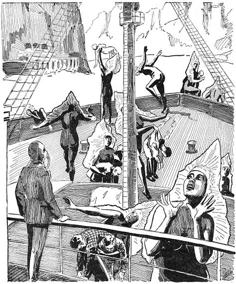 Love the taste of human flesh. Occasionally deploy magnetic super-ray to pluck ships from distant ocean. Eat the crew. Use wasp venom to preserve leftover captives in state of living death. Bodies stacked in central larder. Water wakes them up.