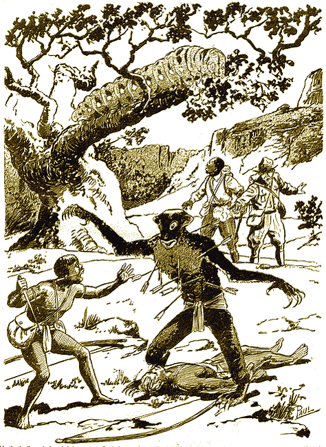 Scarlet reptile women. Naked. Thirty feet tall. White lacy reptilian crests adorning head and arms. Live in city of hundred-foot basalt spires that tower above the treetops. Balboa fell in love with one - returned to the valley after writing his manuscript, never seen again.