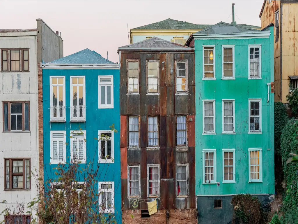 The hills of Valparaiso. Brightly painted houses sloping to the bay.