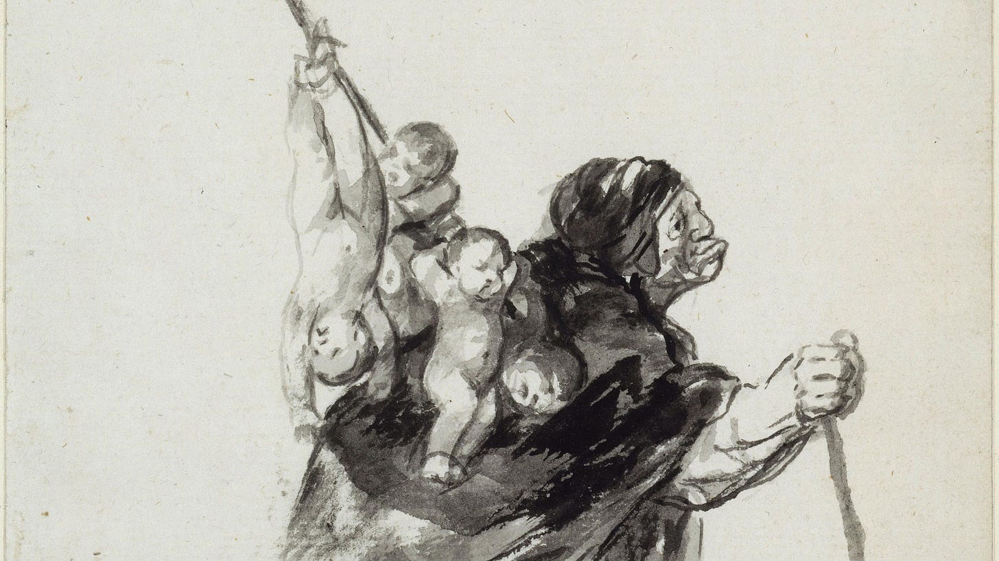 Feeds women noxious elixirs. They vomit up bones and organs - become heads attached to vestigial sacks of skin. Sprout feathers. Change into black birds. Spy on his enemies. Carry messages. Deliver curses. Inflict bad luck by screeching. Peck out eyes.